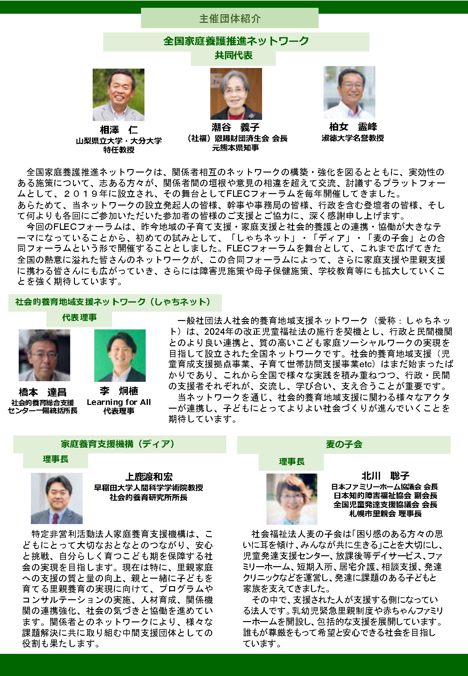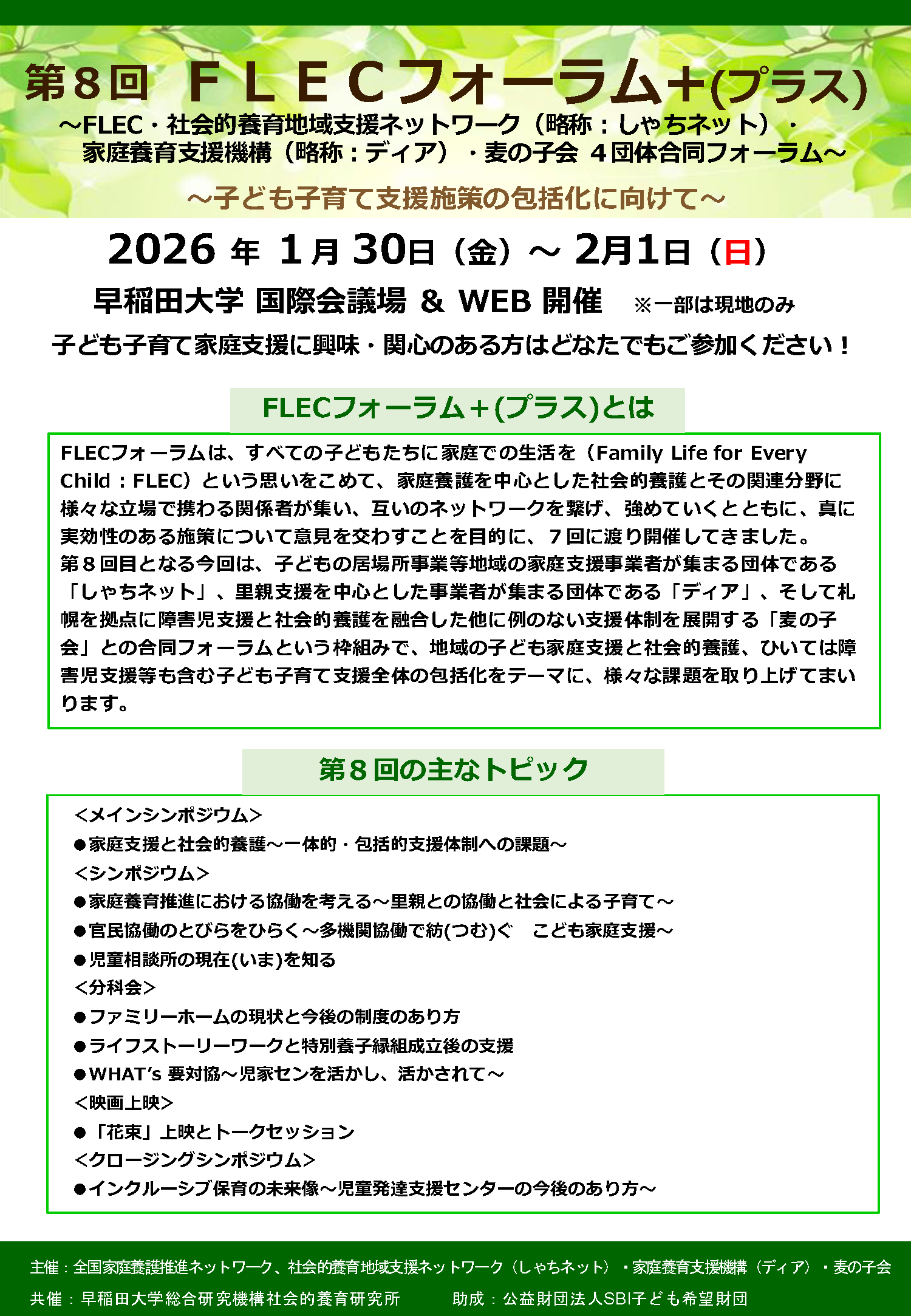 第8回目となる今回は、「社会的養育地域支援ネットワーク(しゃちネット)」、「家庭養育支援機構(ディア)」、「麦の子会」との合同フォーラムとして、「FLECフォーラム+(プラス)」という枠組みで、地域の子ども家庭支援と社会的養護、ひいては障害児支援等も含む子ども子育て支援全体の包括化をテーマに、様々な課題を取り上げてまいります。